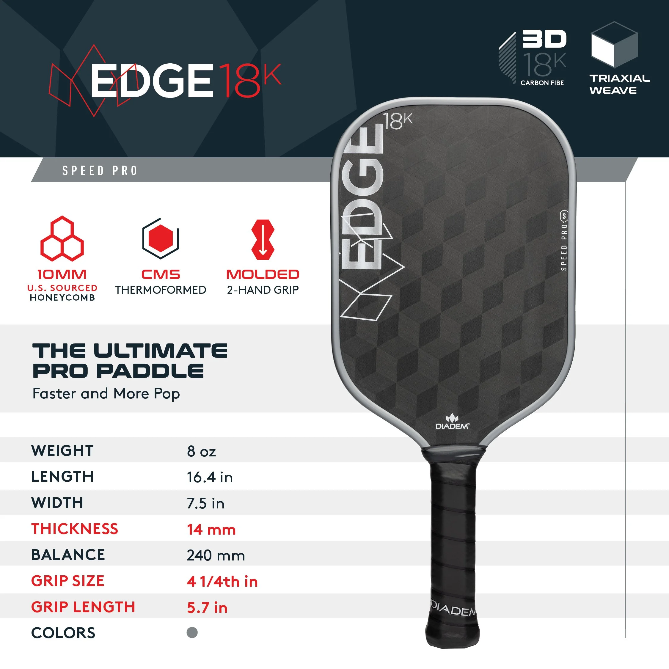 The Diadem Edge 18K Speed Pro is engineered for high-level pickleball players seeking exceptional speed, power, and control. This paddle features a 14mm thick polymer honeycomb core with 10mm cells, providing a responsive feel and impressive pop. Its 3D 18K carbon fiber face enhances spin potential, allowing players to execute precise shots with added spin.